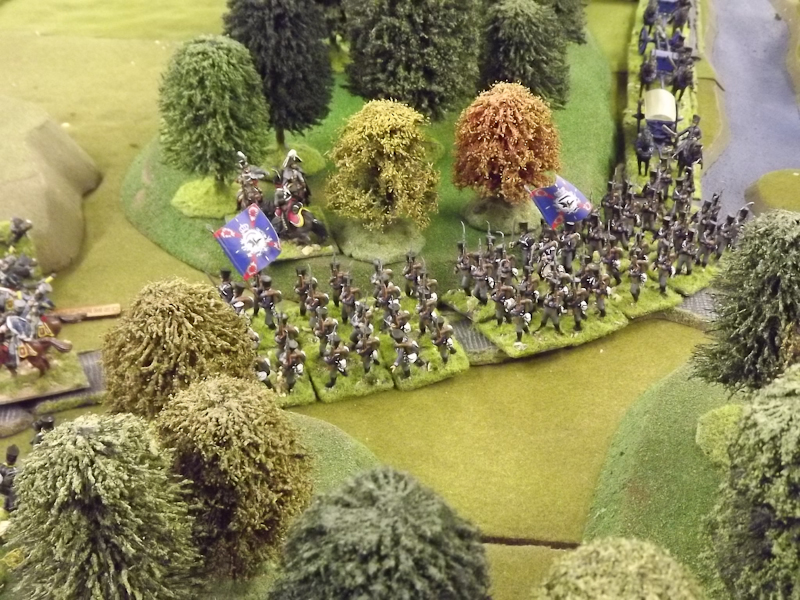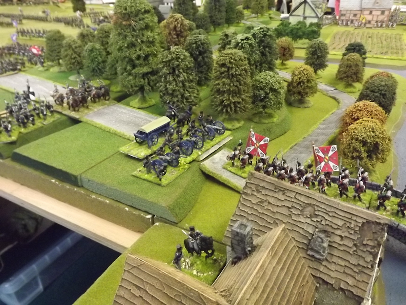 Less happily for Sébastiani’s II Cavalry Corps was the demoralisation of the 2nd Light Cavalry Division. Poor combat results against Prussian Hussars and Russian artillery plus incessant shooting from skirmishers nestling in the woods at the top of the escapement are proving their downfall and with the Prussians advancing on to the plateau there is less and less space for the French to occupy.