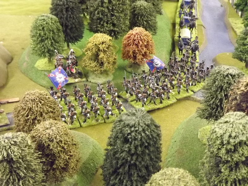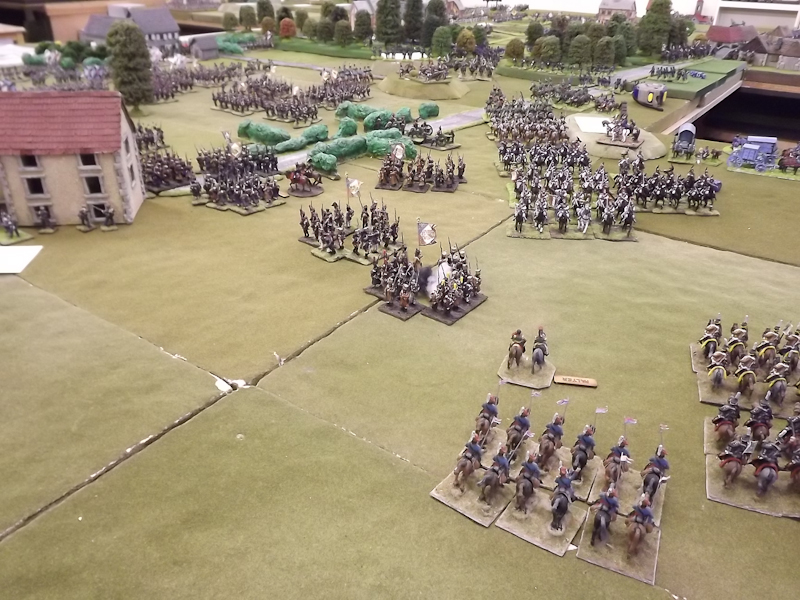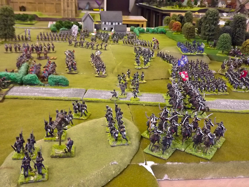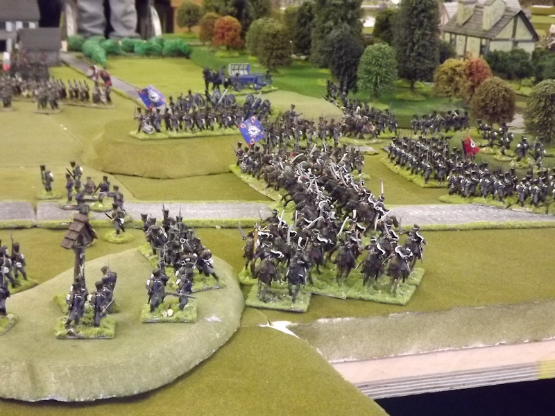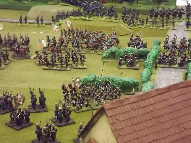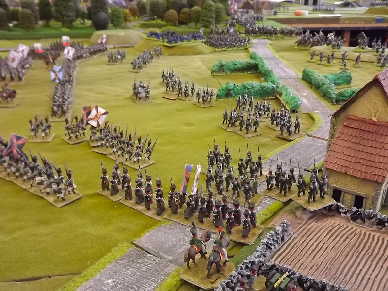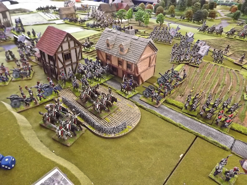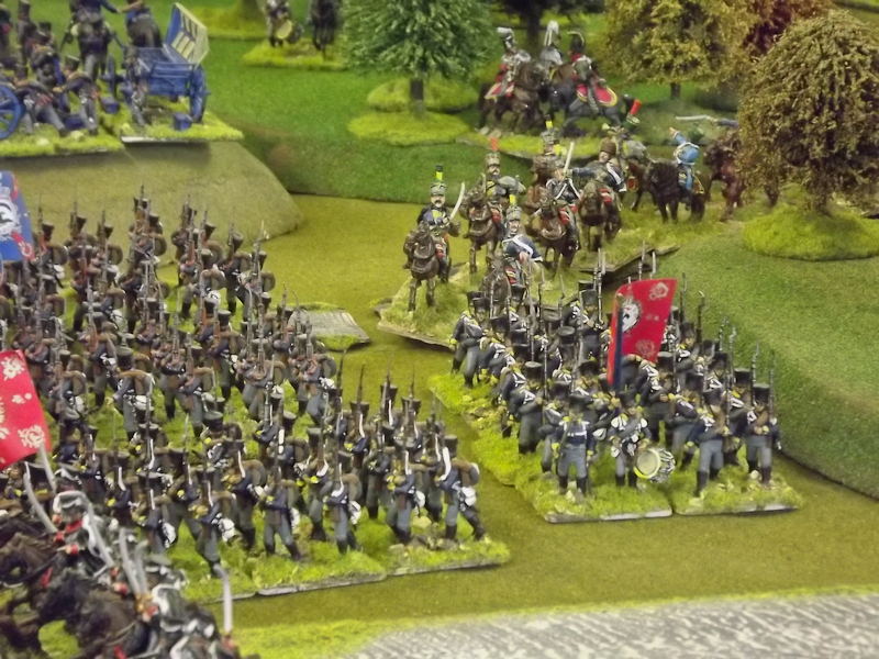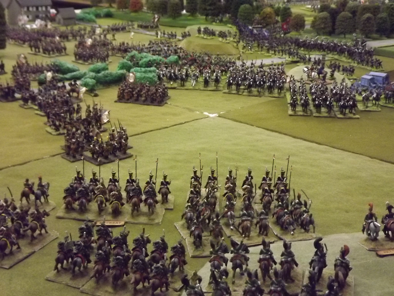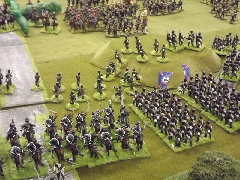 The rest of Sébastiani’s II Cavalry Corps – the 2nd Light Cavalry Division and the 4th Light Cavalry Division – were facing a nightmare of command-and-control in the confined space of the escarpment along the northern bank of the Neisse. The 2nd Light Cavalry had successfully made its way through the wooded defiles on to the plateau only to find their path blocked by Rochambeau’s 18th Infantry Division advancing across their path, whilst behind them Prussian Fusilier battalions were skirmishing in the woods and bring the stationary cavalry under a galling fire which they could do nothing about. Finally, half the division chanced its arm on feeding through a gap on Rochambeau’s right flank, only to fail to over-run an exposed Russian gun battery in a flank charge (the fifth or sixth time the Russians rolled 11 or 12 in a Charge Test that morning…). The 4th Light Cavalry Division fared even worse; stuck on the roads leading up from the Nieder-Krayn bridge they encountered Yorck’s Prussian Hussars under General Jürgass also in march column on the narrow valley road: round one went to the Lanciers du Ligne; round two to the Prussians, sending Exelman’s command reeling back across the Neisse and allowing Yorck’s Prussian foot to continue their remorseless advance right between the two wings of the French Army. MacDonald had clearly lost control of the battle, hampered by the terrain and some shocking lapses in command [French die rolling on the left flank was almost epically poor: 2 or 3 rolled in Charge or Discipline Test after Charge or Discipline Test].