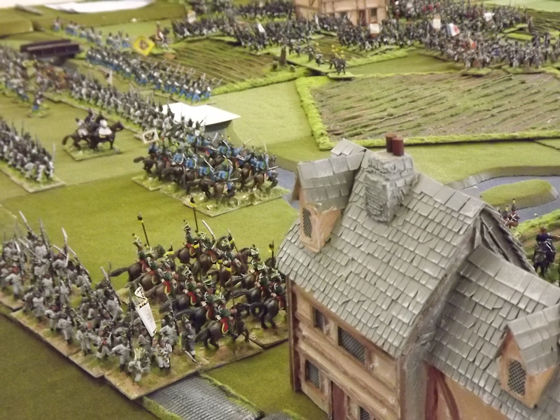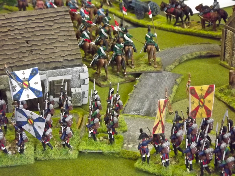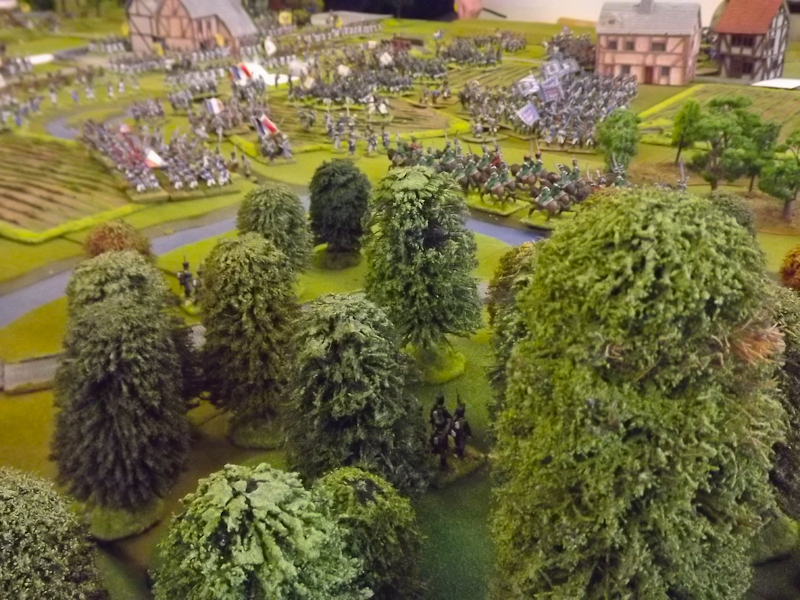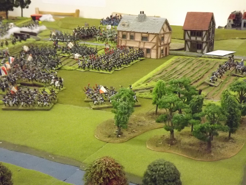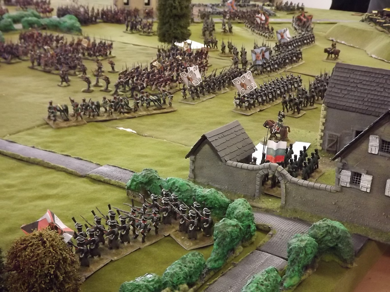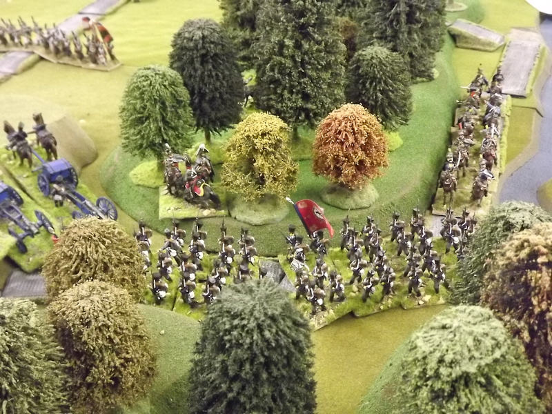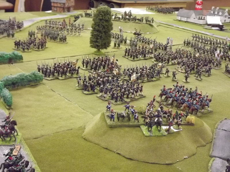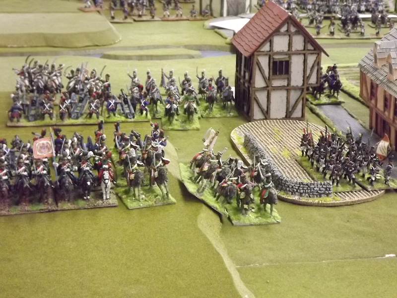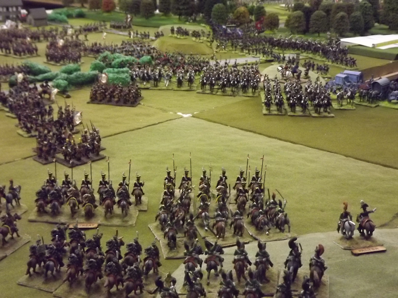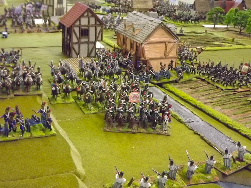 The rest of Sébastiani’s II Cavalry Corps – the 2nd Light Cavalry Division and the 4th Light Cavalry Division – were facing a nightmare of command-and-control in the confined space of the escarpment along the northern bank of the Neisse. The 2nd Light Cavalry had successfully made its way through the wooded defiles on to the plateau only to find their path blocked by Rochambeau’s 18th Infantry Division advancing across their path, whilst behind them Prussian Fusilier battalions were skirmishing in the woods and bring the stationary cavalry under a galling fire which they could do nothing about. Finally, half the division chanced its arm on feeding through a gap on Rochambeau’s right flank, only to fail to over-run an exposed Russian gun battery in a flank charge (the fifth or sixth time the Russians rolled 11 or 12 in a Charge Test that morning…). The 4th Light Cavalry Division fared even worse; stuck on the roads leading up from the Nieder-Krayn bridge they encountered Yorck’s Prussian Hussars under General Jürgass also in march column on the narrow valley road: round one went to the Lanciers du Ligne; round two to the Prussians, sending Exelman’s command reeling back across the Neisse and allowing Yorck’s Prussian foot to continue their remorseless advance right between the two wings of the French Army. MacDonald had clearly lost control of the battle, hampered by the terrain and some shocking lapses in command [French die rolling on the left flank was almost epically poor: 2 or 3 rolled in Charge or Discipline Test after Charge or Discipline Test].