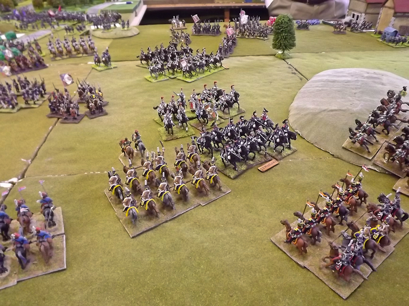 The intervention of Roussel d’Hurbal’s 2nd Heavy Cavalry Division looked to have stabilized affairs on MacDonald’s far right. A decisive cavalry charge (the French cuirassiers scoring 7/7 casualties and “Retiring to Own Lines” so, importantly, remaining Formed!) pinned Tschaplitz’s Russian Cavalry Division back and many of his and Karpov’s regiments are dangerously close to breaking. However, a second Cuirassier charge while victorious leaves the French troopers exposed to a counter-attack [“Unformed”] from the still superior numbers – at least in terms of regiments – of Russians under Sacken’s overall direction.