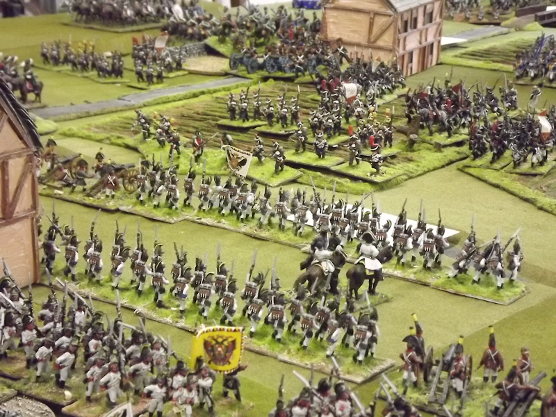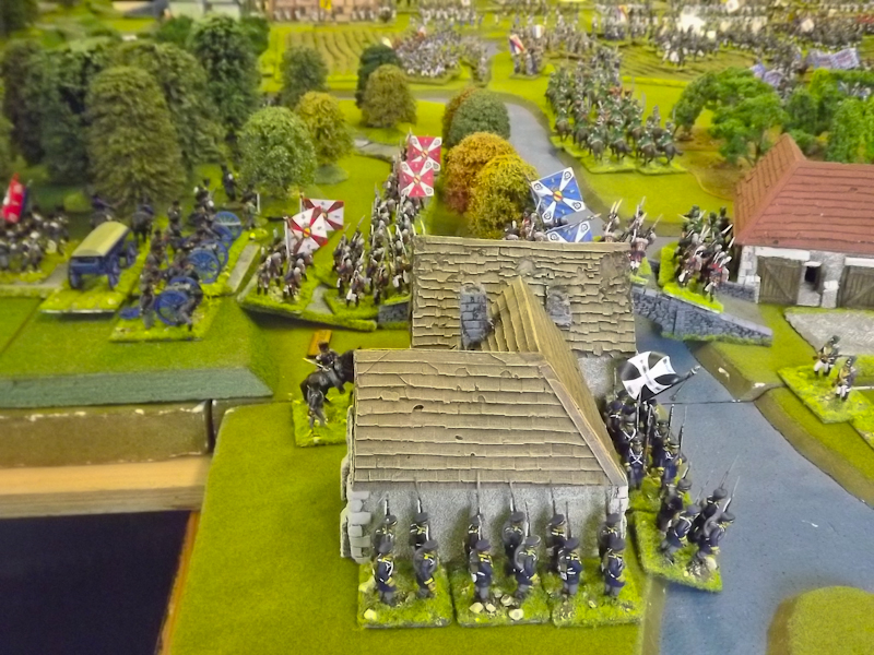 On the right flank Souham’s III Corps is also struggling. Some excellent shooting by the horse artillery attached to Beurmann’s Cavalry Division forced an Austrian battalion out of line but the opportunity to exploit the gap was lost as Brayer’s 8th Division chose that moment to temporarily lose its nerve [as a “Faltering” command due to the loss of a lead unit it failed its Command test – despite an ADC attachment – and rolled “Retire”]. Langeron has almost completed the ordering of his multiple lines of Austrian infantry and is looking confident. The 9th Division under Delmas is heading northeast for Schlauphof and its ford over the Neisse but a gap is opening behind as the 10th and 11th Divisions seem to take turns in failing to advance [one or both are often “Hesitant” and Souham cannot spare the ADCs to give them a re-roll]. The Badeners of Marchand’s 39th Division – originally intended as Souham’s “coup de grace” formation but now diverted to Nieder-Krayn to regain control of the bridge from Yorck’s Prussians – failed in their first assault. This leaves its column stuck on the bridge facing one Prussian Musketeer battalion in garrison to its immediate left flank and another in line to the front supported by a Prussian gun battery [under the scenario it should not have been able to deploy on the wooded escarpment but the Umpire failed to notice until too late; perhaps some of the trees rearranged themselves!]. There is support available from a Baden Foot Battery and skirmishers but it looks as is a battle of attrition will take too long from MacDonald’s point of view.